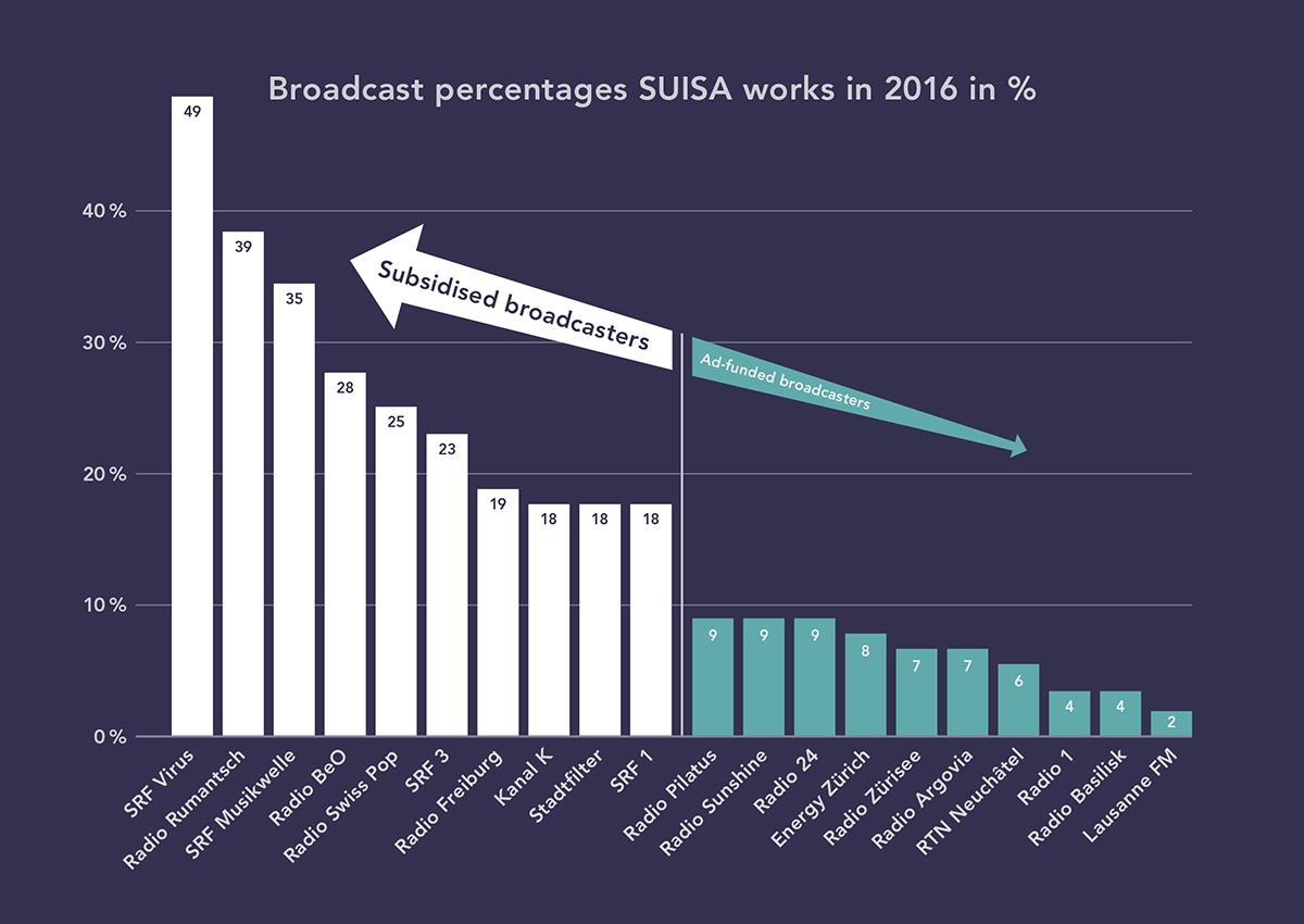 On average, subsidised Swiss radio channels broadcast a higher percentage of music by SUISA members than private radio channels without any public sector funding. In the case of broadcasters which are subsidised by the Swiss Federation, the number of different music titles in the programme is also usually much higher than in the case of their mainly ad-funded counterparts.